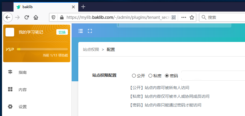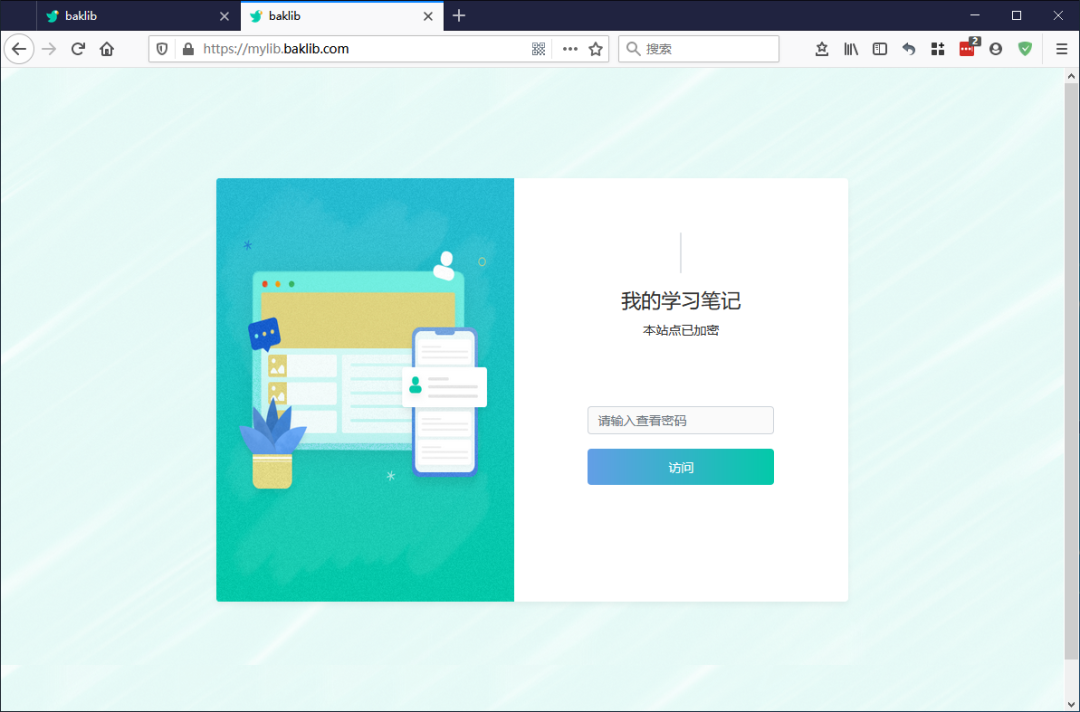 下图是密码访问的界面。比如上面我设置的域名是mylib.baklib.com打开后输入你上面设置的密码就可以查看你的笔记了。密码你自己可以随时修改。密码这个东西不必设置的太复杂,毕竟只是学习笔记而已,机密级别远不如银行卡密码、邮箱密码之类的。