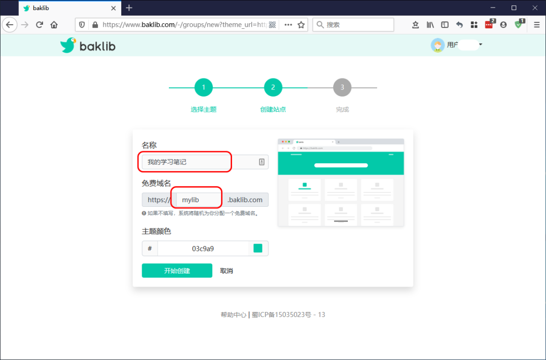 然后设置个名称和域名。要记住这只是你的一个笔记本。你可以建立很多个笔记本,每个笔记本支持最大1G空间。别小看1G。比如用来记录统计学习,你能把1G用文字和图片填满,你已经是大神了。你可以不重新注册新账户的情况下,新建多个笔记本,这里它称之为站点。是因为你可以设置整个站点是完全公开,还是完全私有,还是凭打开密码可以外人查看,三种类型。