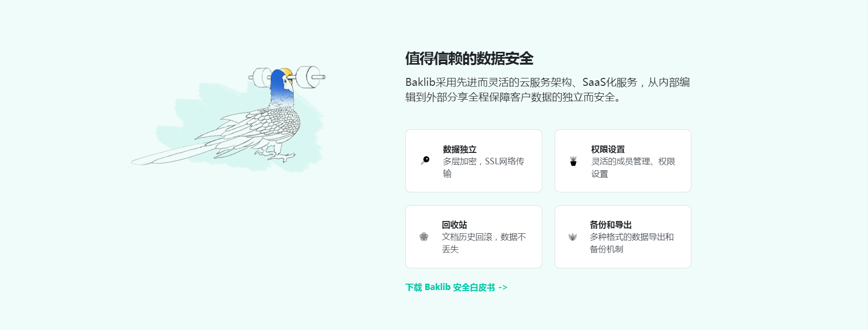 baklib 支持数据的备份和多种格式的导出,采用 SSO 单点登录与 SSL 加密技术,从内部编辑到外部分享全程保障客户数据的独立而安全,为你的知识、文档保驾护航。