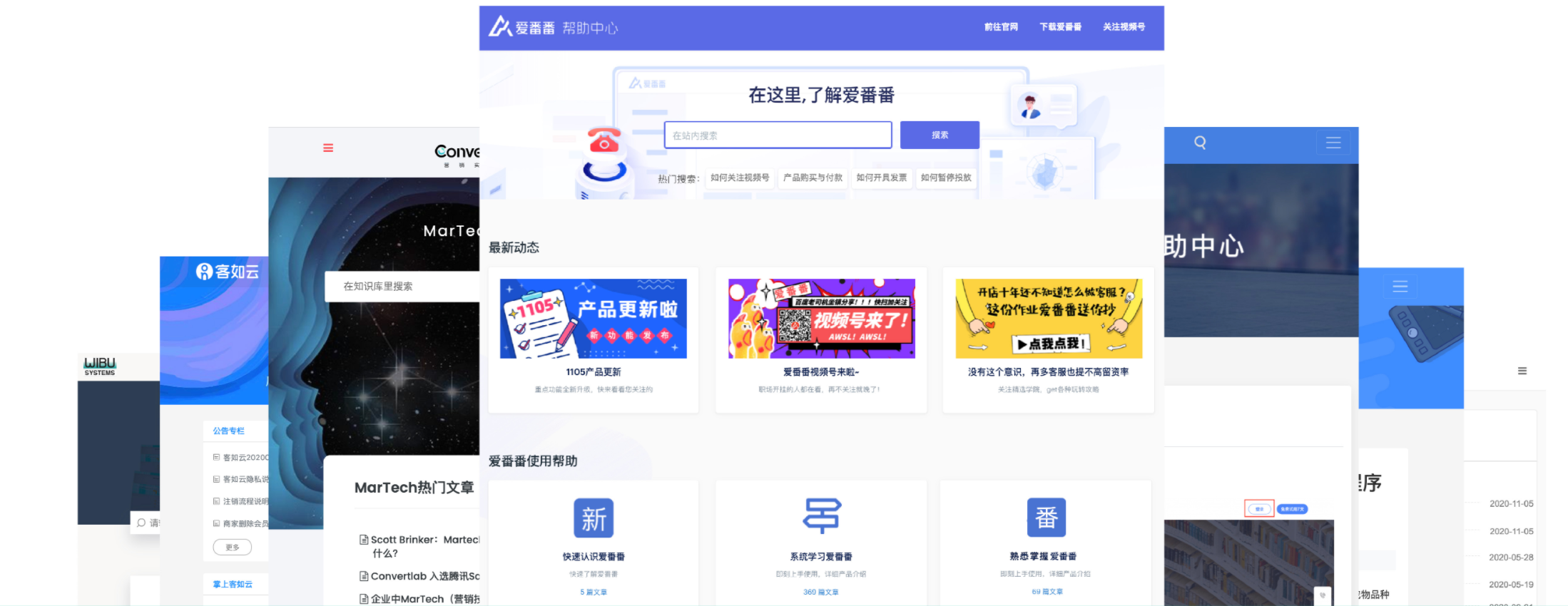 - 模板:可选的各类模板多,可找到适合自己产品风格的首页。一键替换的同时,可自定义的部分也扩展了更多展现样式,解决了原帮助中心没有首页的问题。