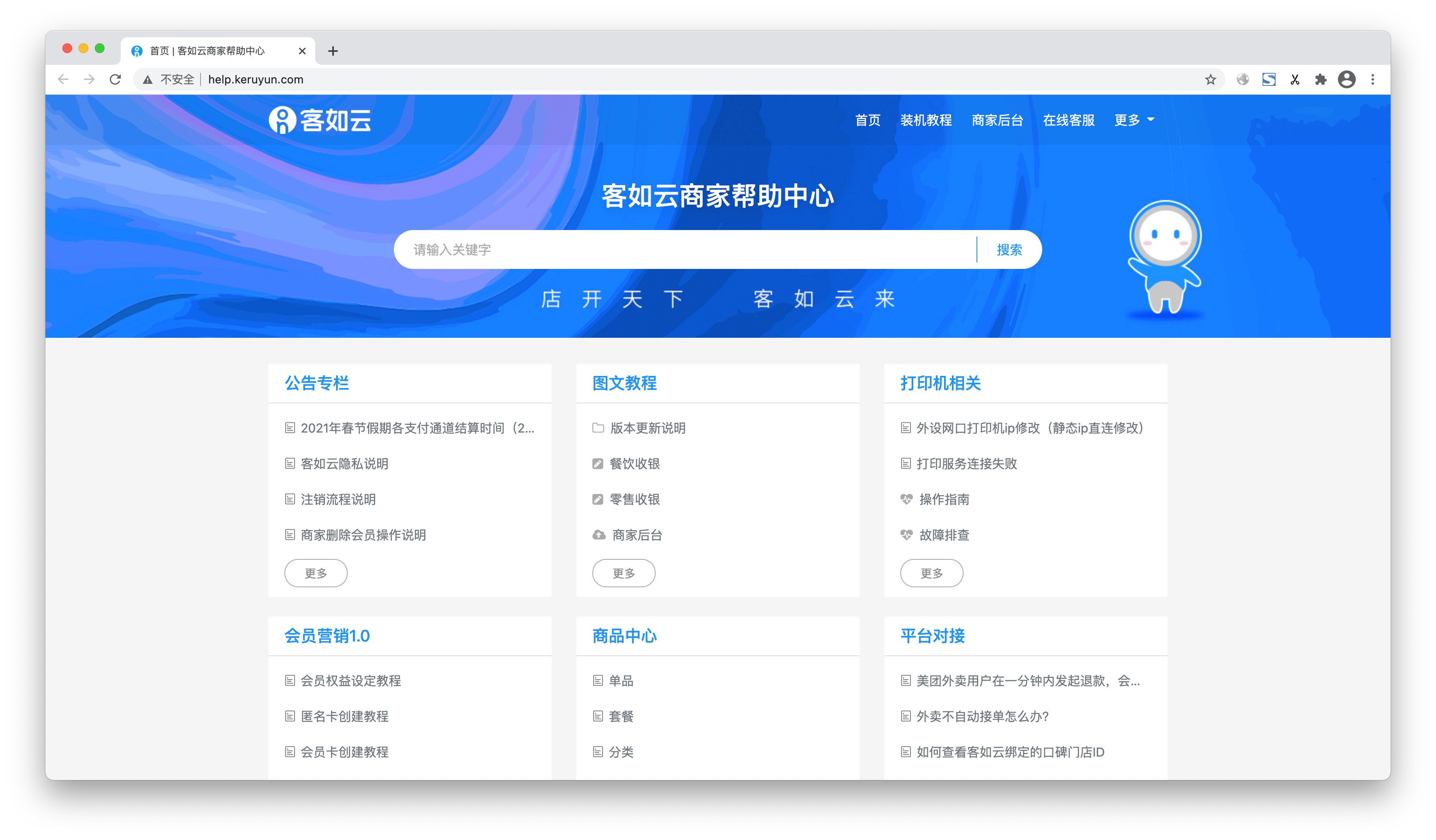 客如云面向本地生活服务业商家,为其提供软硬件一体的 SaaS 整体解决方案,是餐饮零售 SaaS 行业的领军企业,目前业务遍布北京、上海、广州、深圳、成都、武汉等近 100 个城市,员工总数 5000 余人,全国拥有超过 800 家授权代理公司,服务商户超过 60 万 +。其通过 Baklib 制作在线帮助中心,在各产品网站、 客户端放置帮助中心入口,实现一端更新多端同步的低维护成本。
