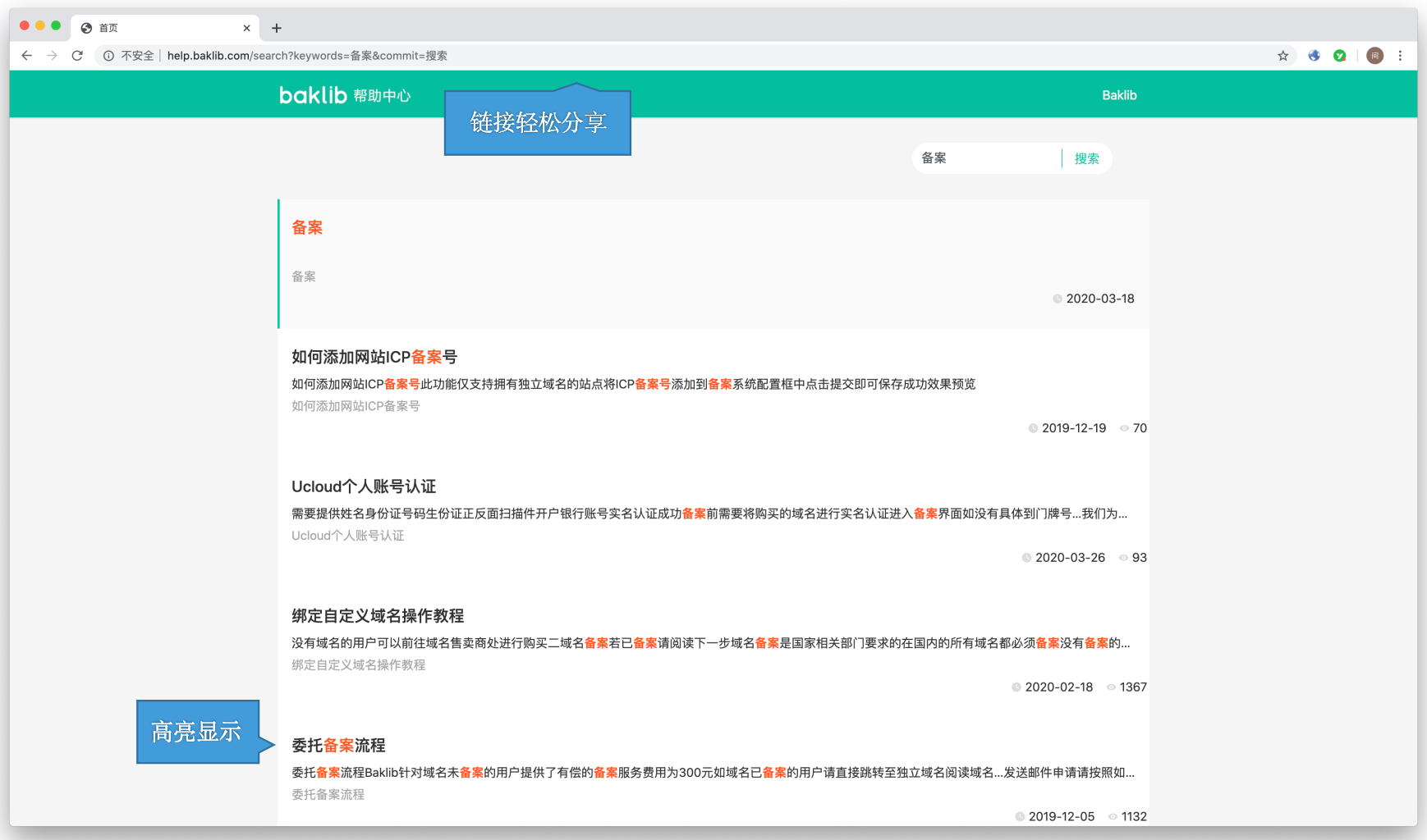 Baklib 采用类似百度的搜索框,输入关键词就能找到相应文章,并且搜索结果关键词高亮显示,方便进行 FAQ 的管理,点击相应问题就能看到答案。