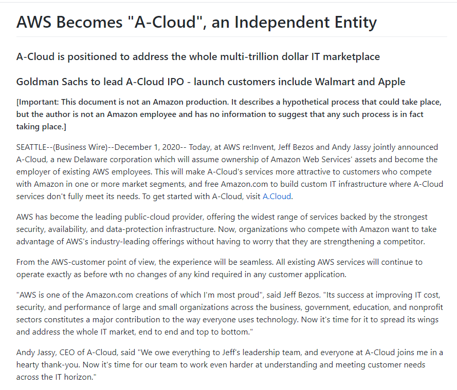 我们看这个文档的通篇内容,文档描述了一个并不存在的产品 “A-Cloud”,通过阅读我们其实可以发现,整个开发 MVP 的想法都是基于进入市场前团队站在客户的角度自行挖掘出的潜在客户需求,而且作者还利用文档的形式说明了自己的产品的价值,即使这个产品可能并不存在