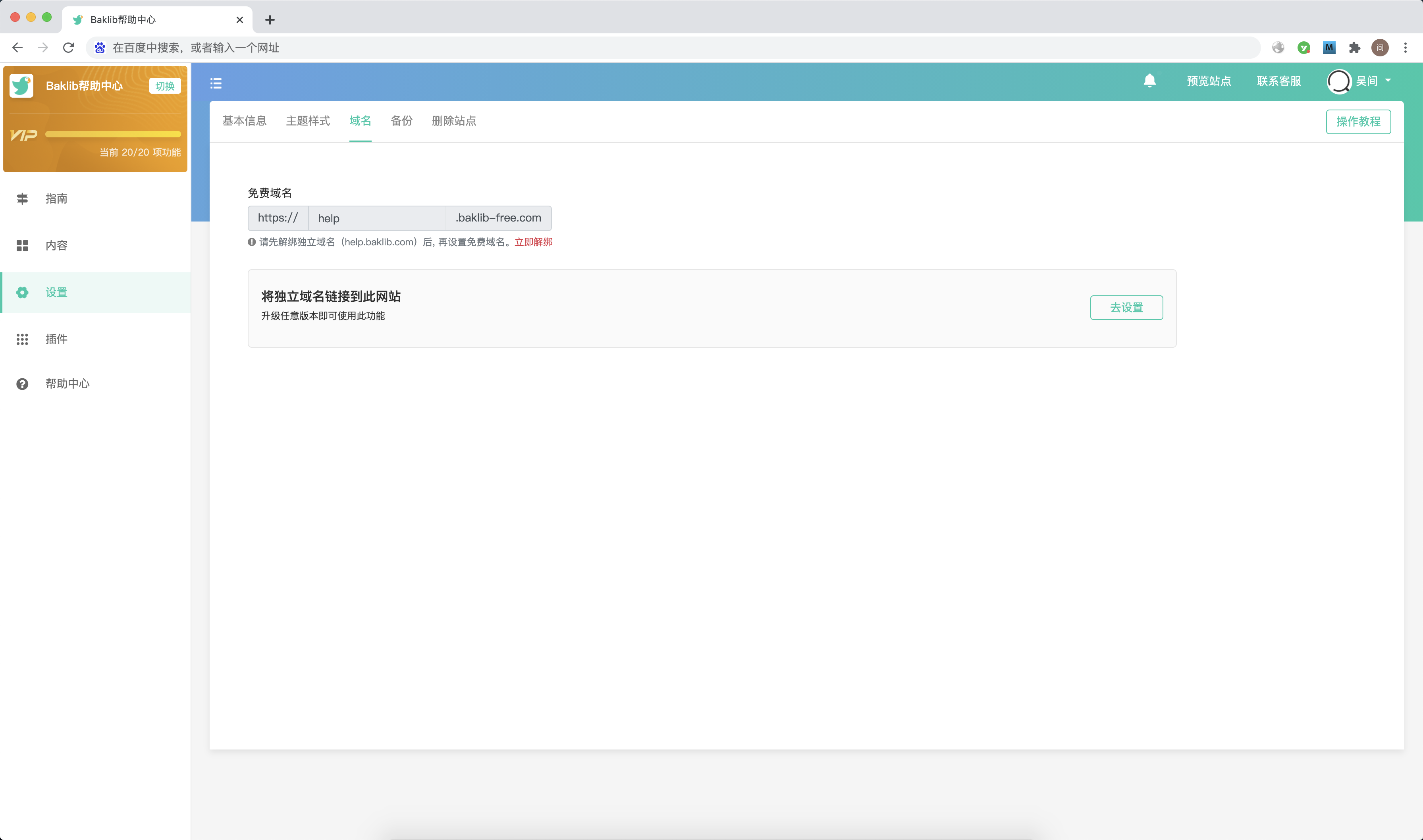 Baklib 提供了免费的二级域名,同时用户也可以绑定独立域名。小鸟建议产品知识库的话还是需要使用自己的域名才显得正式哦!