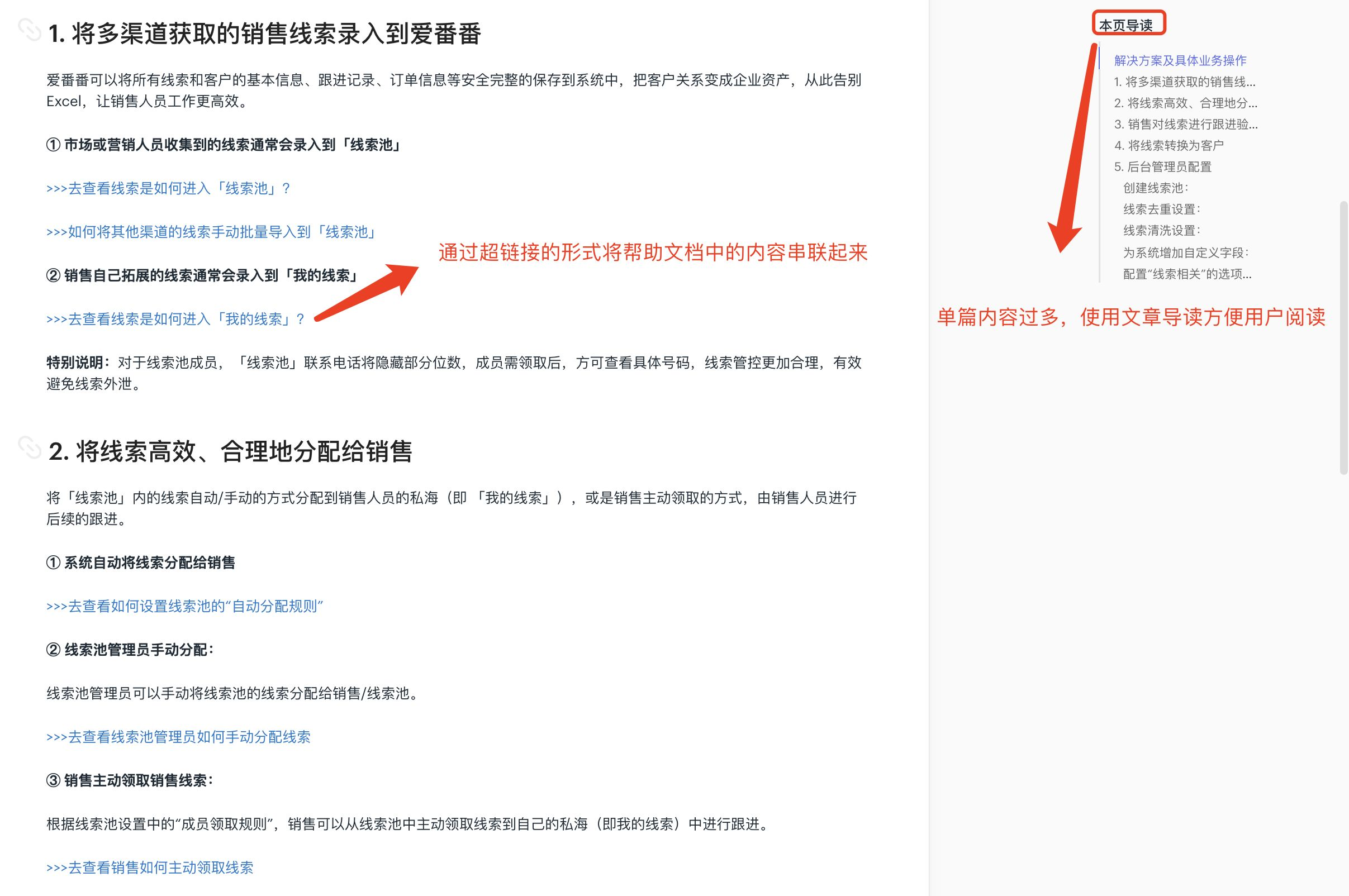 帮助文档中的每一篇内容都不是孤立存在的,在向用户介绍产品单个产品功能的时候,都会存在一个或多个与之关联的功能。使用内容关联的形式不仅可以帮助用户加深对产品的理解,而且会使得单篇文章内容不会显得太冗长。(长篇大论的阅读性质极低)