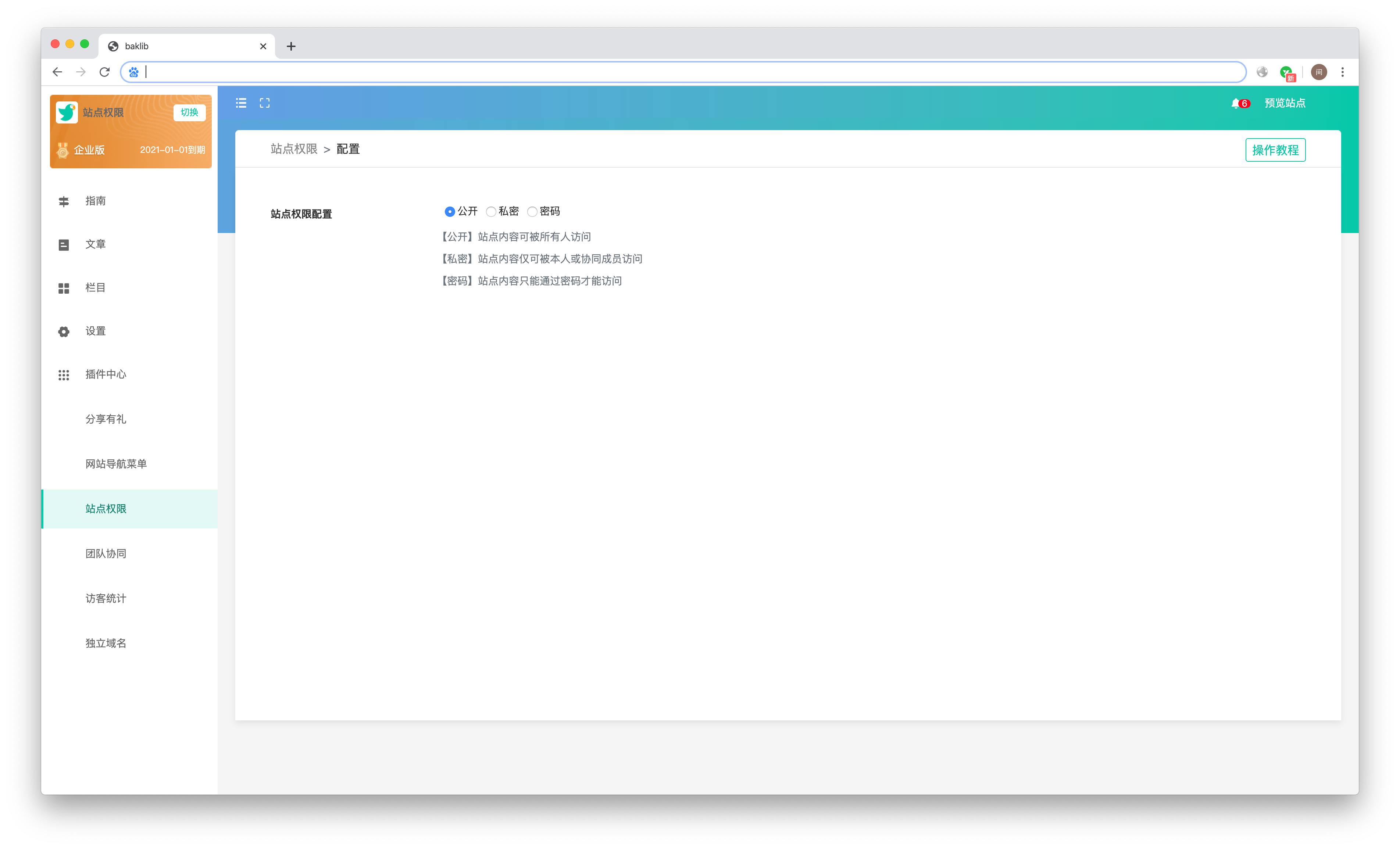 使用 Baklib 可以自由的修改网站的访问反问权限,从而可以决定谁可以查看内容。在企业的帮助中心。为可以为代理商创建一个内部帮助中心。将某些文档设为私有,并且仅对选定的少数文档可见,而其余文档则保持公开状态。这有助于企业自动控制客户可以看到或看不到的内容。
