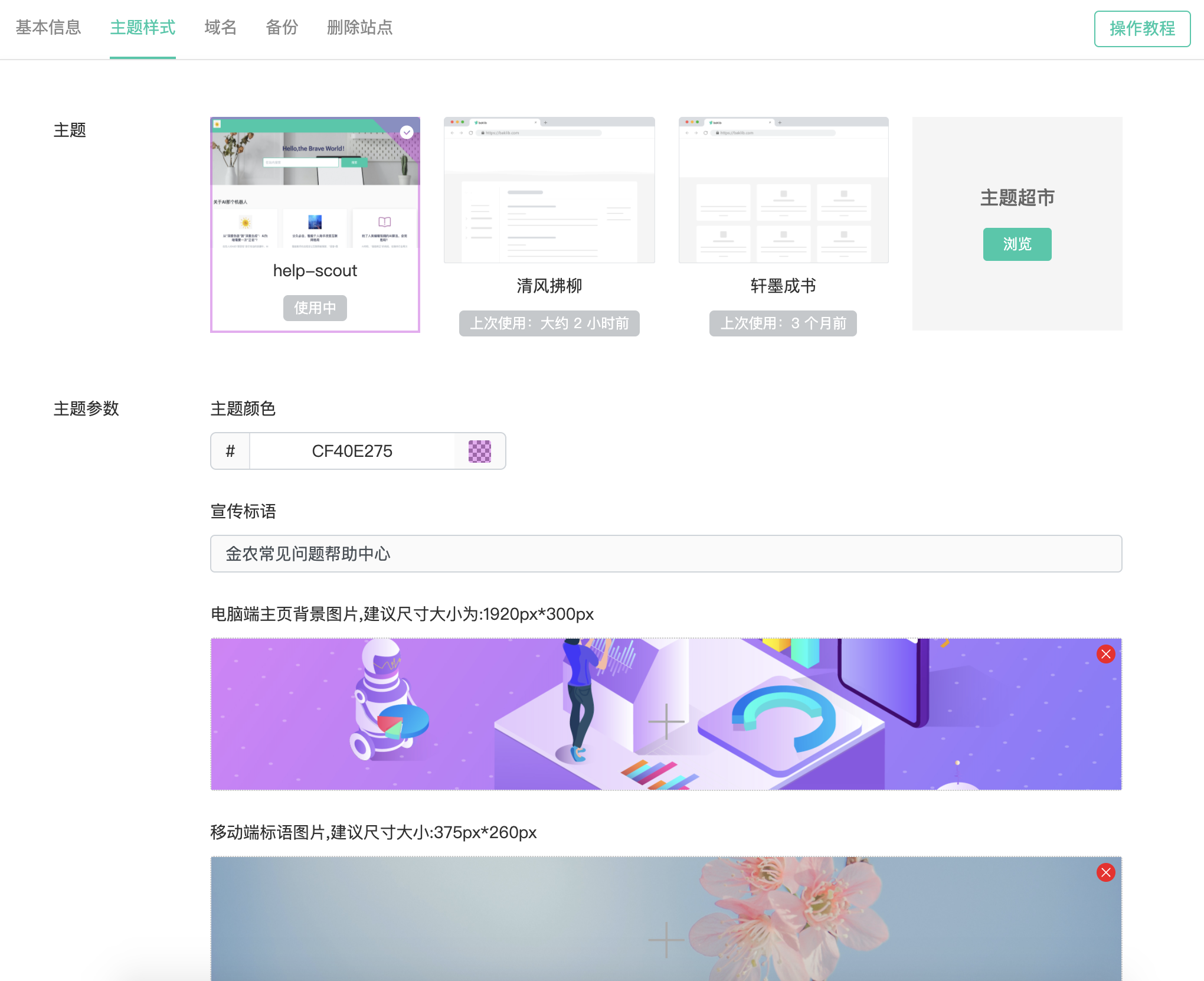 选择帮助中心站点对外展示的主题模版,颜色,宣传标语,添加主题的头部显示的大图。